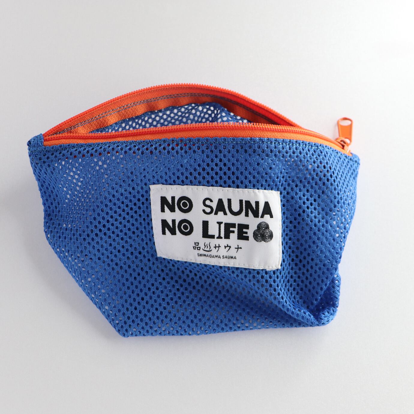 「NO SAUNA NO LIFE」のロゴと、ポップなカラーリングが目を引くメッシュポーチ